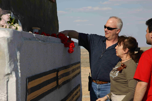 For those who don’t know, at the entrance to Area 95 in Baikonur is The World War II Monument, depicting a soldier pointing to the west, the direction of the major Russian allies during the war.  In the late afternoon, nearly the entire campaign team gathered for a walk  (a parade) from the Fili hotel down to the Monument.  It is customary to lay flowers at the monument as a memorial.  And this parade was no different.  Led by the Director of Operations in Baikonur, we walked to the monument to lay down our floral offerings.  Many people made this same trip over the course of the day, as people were coming and going over the entire afternoon.  It was quite an emotional event for many of the parade goers.